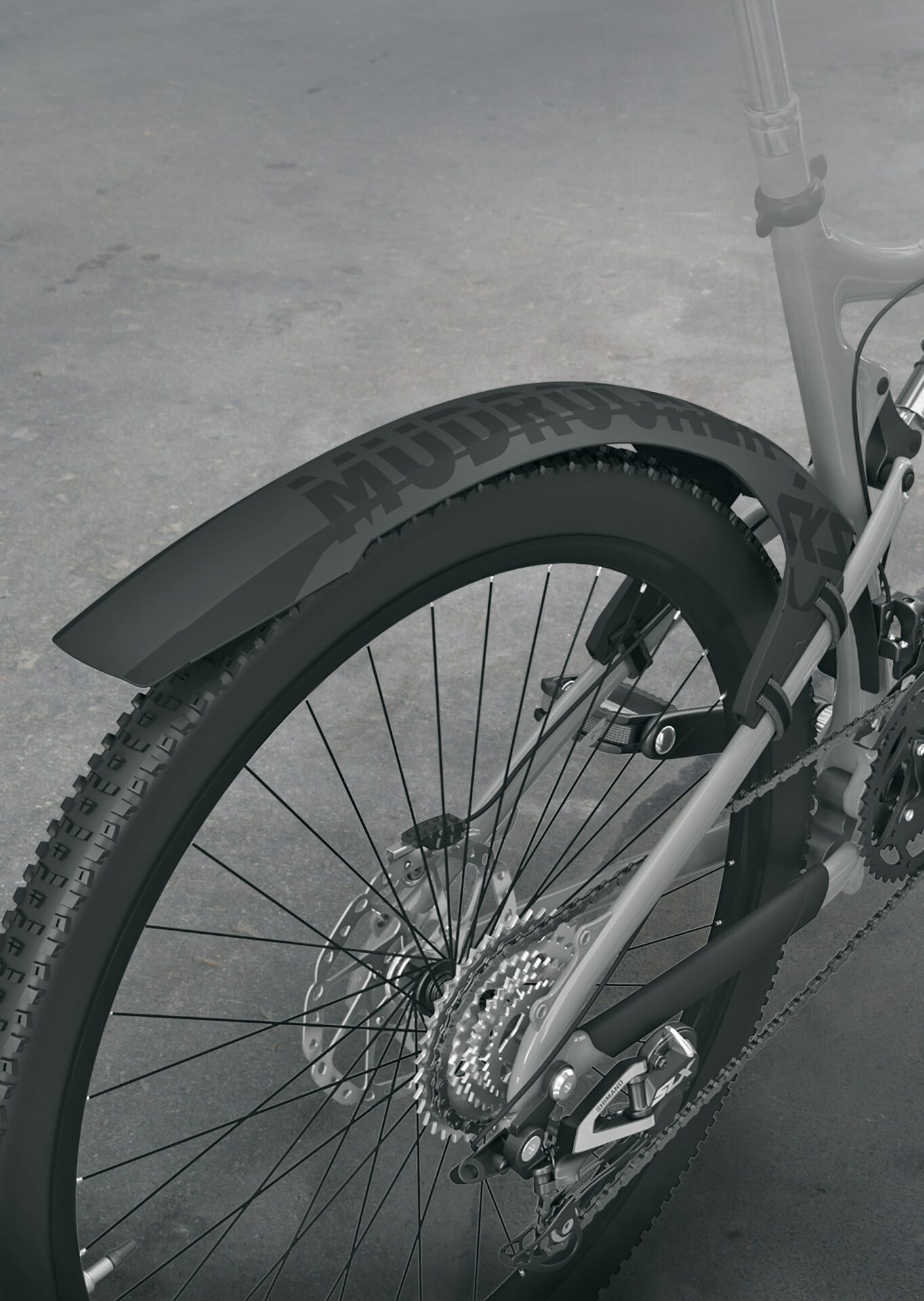 Zadní designový blatník pro celoodpružená kola. Součástí blatníku je prodlužovací díl, který chrání střed, přesmyk a oblast tlumiče. Může být upraven nůžkami podle potřeby, či nemusí být použitý vůbec.